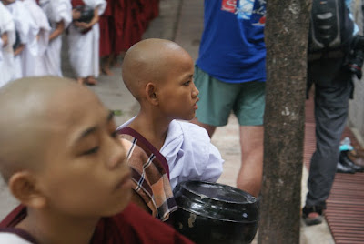 Wspieranie lokalnych społeczności jakby to przeciętny NGO nazwał to jedna sprawa. Coś jednak widzieliśmy. Mandalay Hill średnio ciekawe. Wjechaliśmy na górę pickupem, a schodzić musieliśmy kawał drogi na boso, bo to taki szlak pielgrzymkowy. Brudno, naplute tym czerwonym świństwem co to żują wszędzie, ohyda. Nie dziwne że buddyści uważają nogi za najbrudniejszą część ciała. O 4 AM w jednej ze świątyń odbywa się rytuał mycia buddy. Zamówiliśmy dwa rowery i pojechaliśmy. Pieniądze dla mnichów rozmienione, bo oni zwykle rano chodzą i zbierają do garnuszków jedzenie i pieniądze. Ledwo dojechaliśmy i zauważyłem kilku. Wrzuciłem do pierwszego kubełka, i patrzę a tu kolejka na 30 osób się robi!!! Jeden za drugim ustawiają się w szeregu jak jeden mąż. Wrzucić coś trzeba każdemu. Uroczystość sympatyczna choć nieciekawa. Mimo wszystko to jedna z ciekawszych rzeczy jaką w Mandalay można zrobić. Świątyń niby mnóstwo ale każda taka sama.